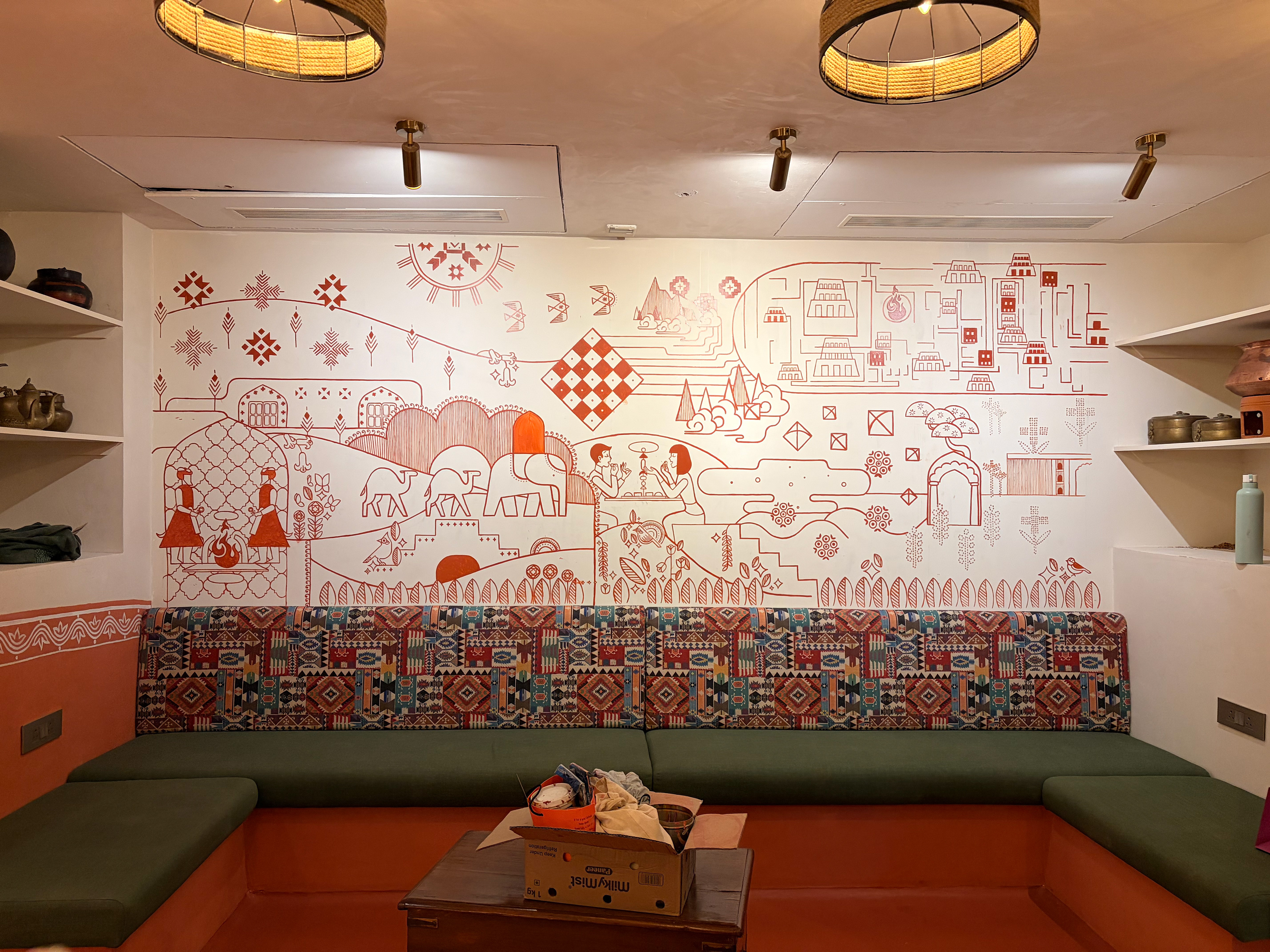 The first mural centres around the chulha-chowki — the traditional wood-fired stove used in rural Rajasthan.