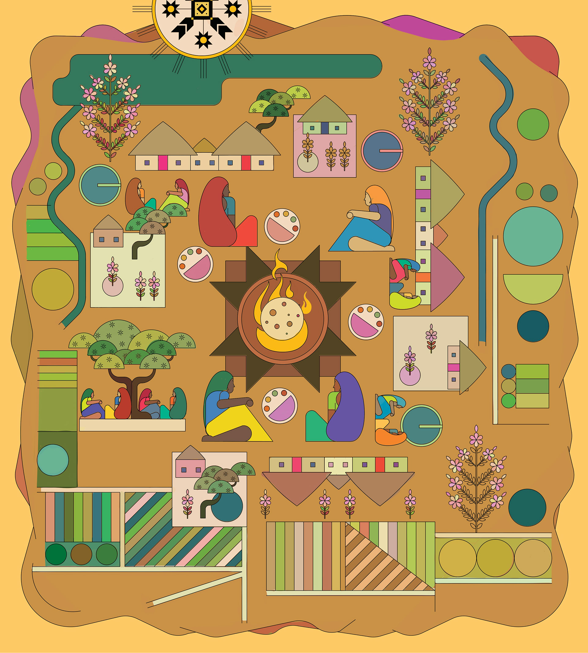 Women gather around it, cooking, serving, and sharing food in a continuous rhythm of care and labour.