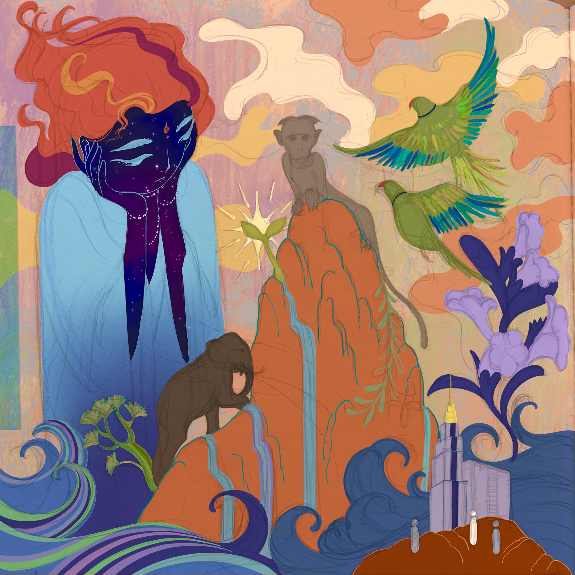 A sapling emerges from the mountain — a quiet symbol of regeneration.